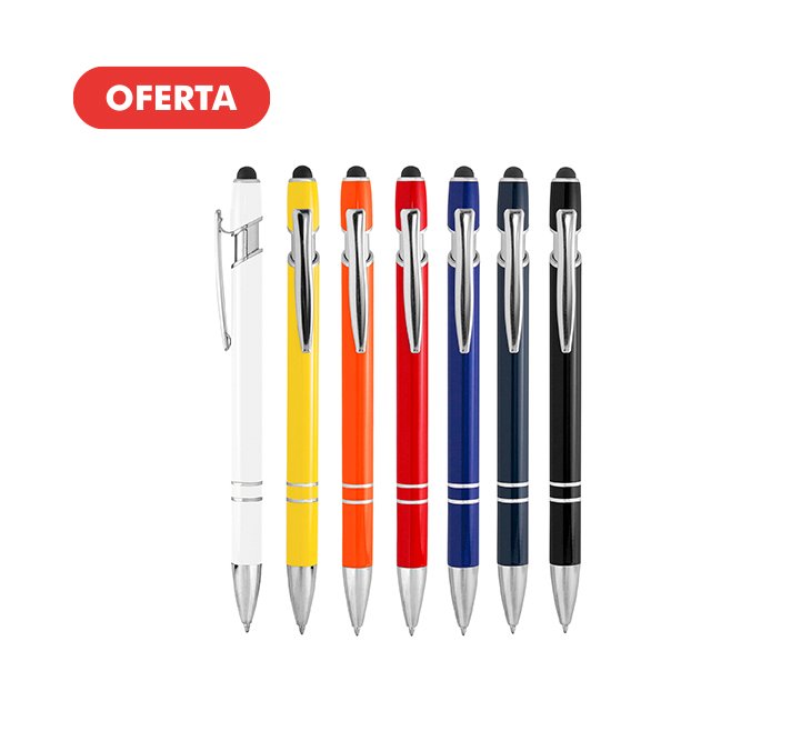Bolígrafo retráctil metálico con pulsador touch. Cuerpo de aluminio de diferentes colores con acabado laca. Puntera, anillos, clip y detalles del pulsador en plateado brillante.