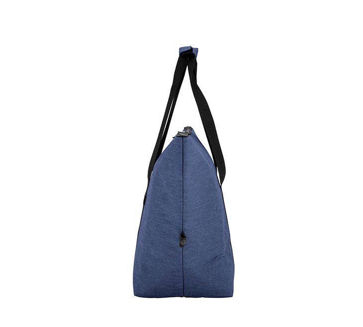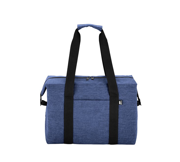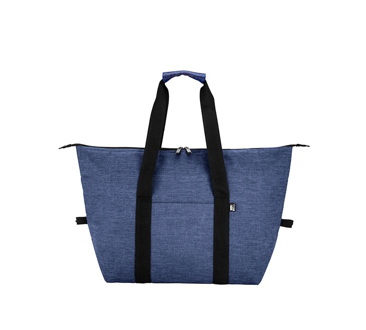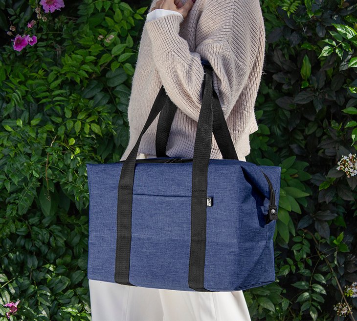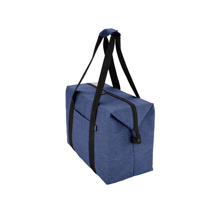 Bolso térmico. Cierre posterior con dos tiradores. Hebillas metálicas en los laterales que permiten cambiar su formato a prisma. Bolsillo frontal. Dos asas con refuerzo de velcro.