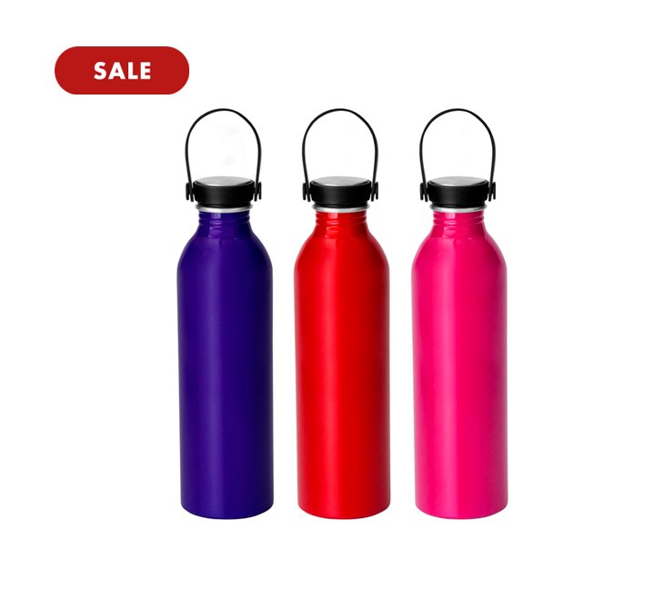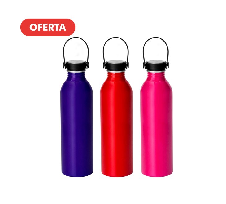 Botella de aluminio con acabado brillante. Tapa a rosca de acero inoxidable 201 y PP, con tira de silicona color negro.