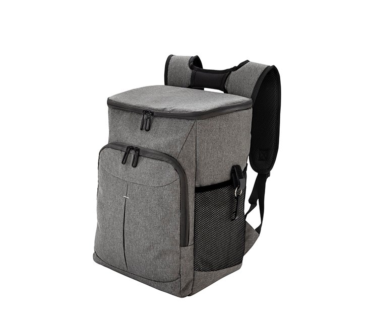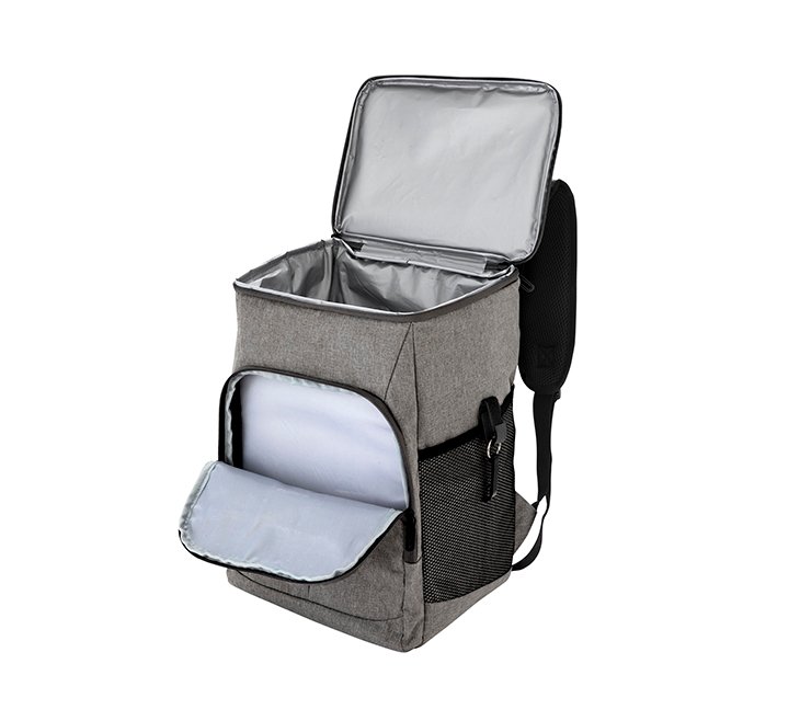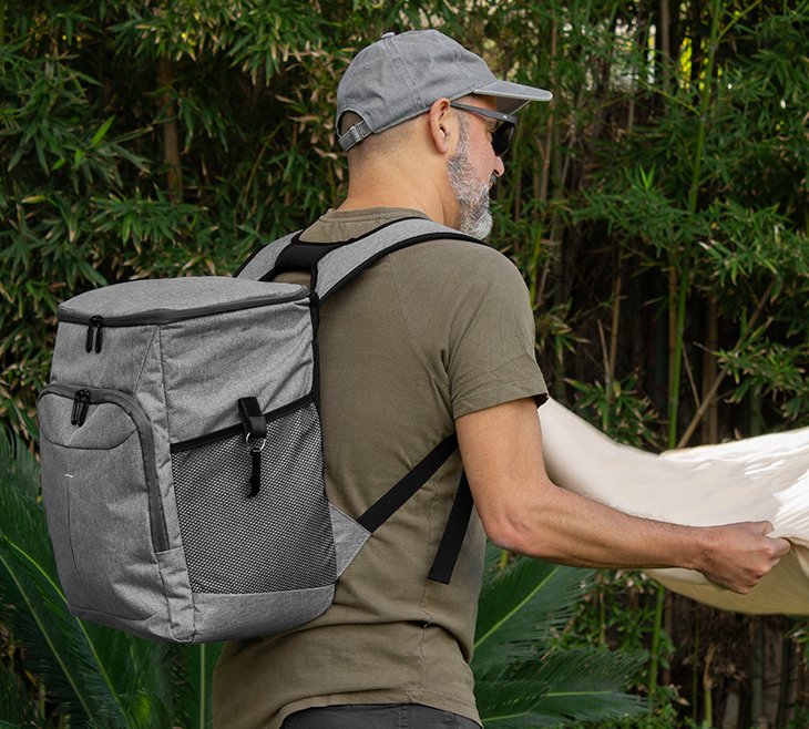 Mochila cooler. Compartimento principal con cierre en la parte superior. Compartimento frontal con cierre. Dos bolsillos laterales de red multipropósito. Incluye llavero destapador de botellas de aluminio (5,5 x 1,1 cm) extraíble. Correas regulables acolchadas y reforzadas. Cierres metálicos. Tiradores de cierre metálicos de color negro.