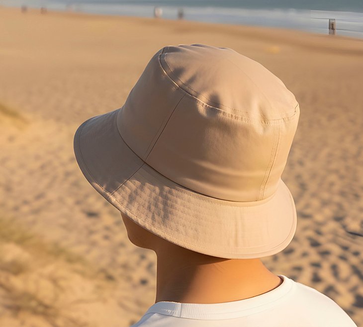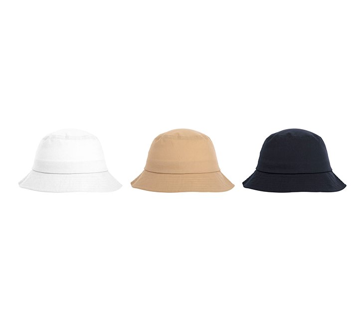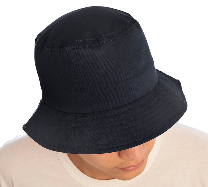 Gorro pescador. Ala ancha. Costuras reforzadas. Banda absorbente de poliéster. Medidas: Ø 28 cm. x 8,5 cm. / Ala 5,5 cm. / 57 cm. circunferencia. Materiales: 100% algodón liviano y poliéster.