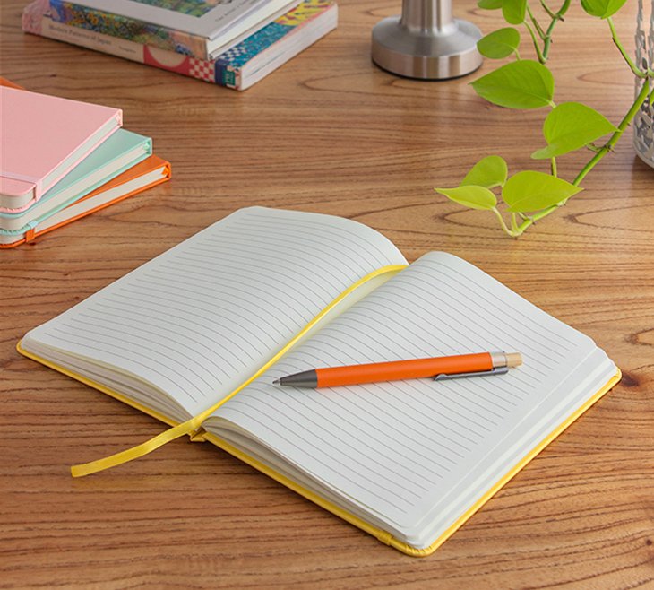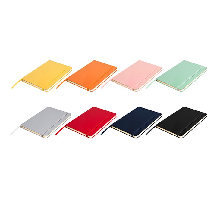 Libreta. Tapa de cartón de 300g recubierta en poliuretano de diferentes colores. Interior de 80 hojas rayadas en papel obra crema de 80g. Encuadernación cosido. Incluye cinta señaladora del color de la tapa. Cierre con banda elástica del mismo color.