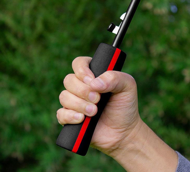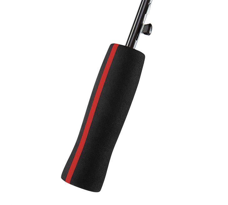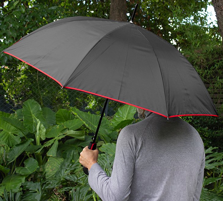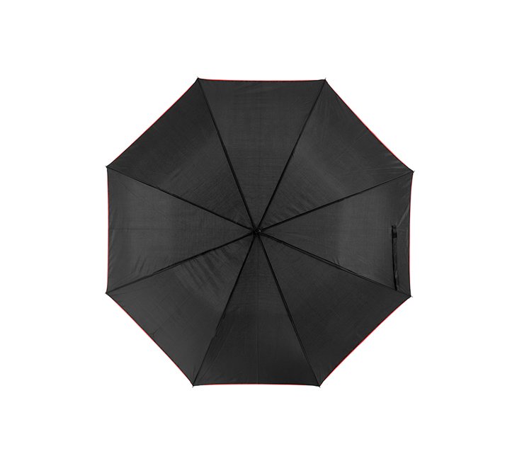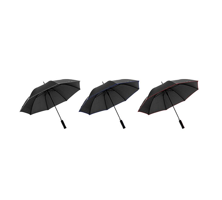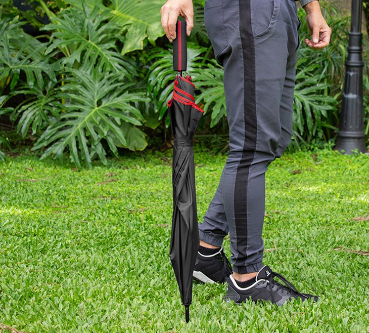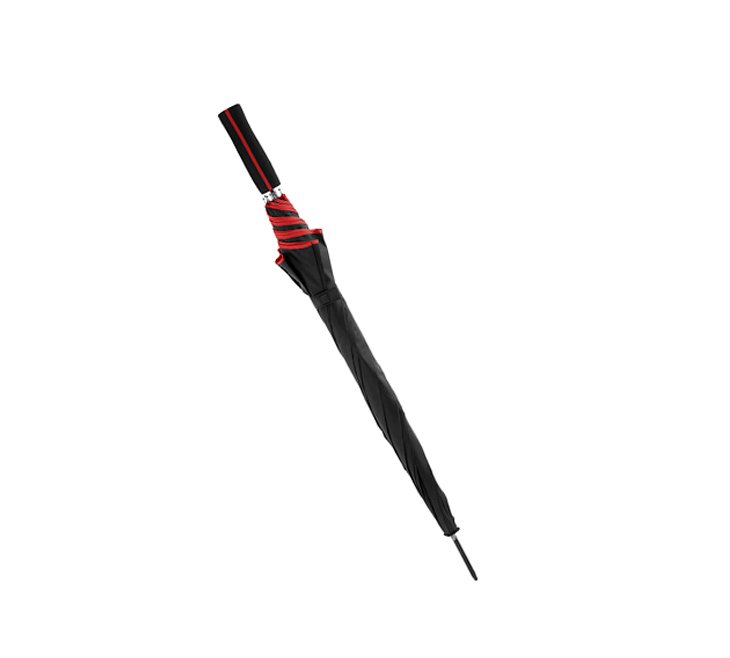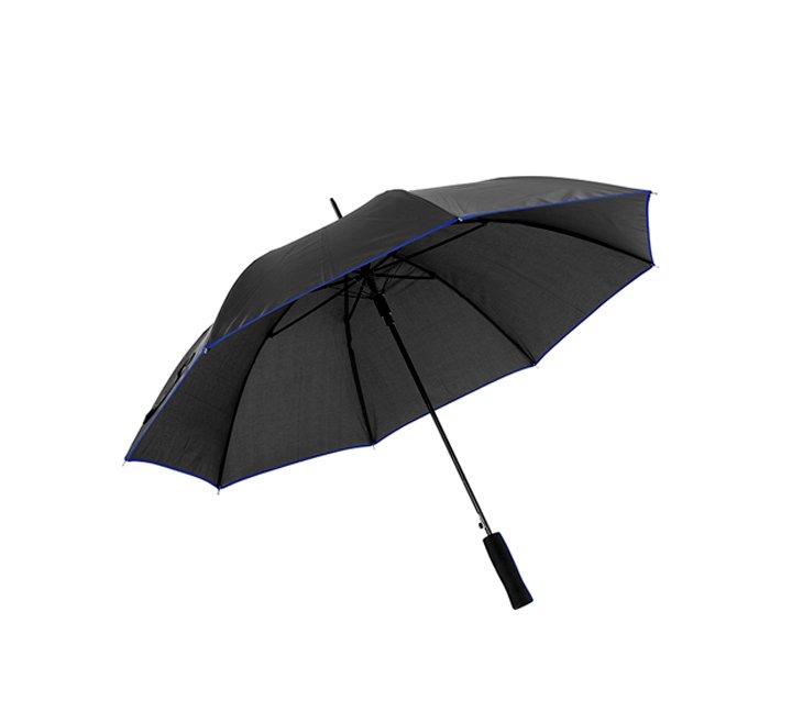 Paraguas APERTURA AUTOMÁTICA Y CIERRE MANUAL. Eje y varillas metálicas. Mango de goma eva de doble color. Botón a presión. Cubierta y funda de poliéster. Cierre con correa de velcro.