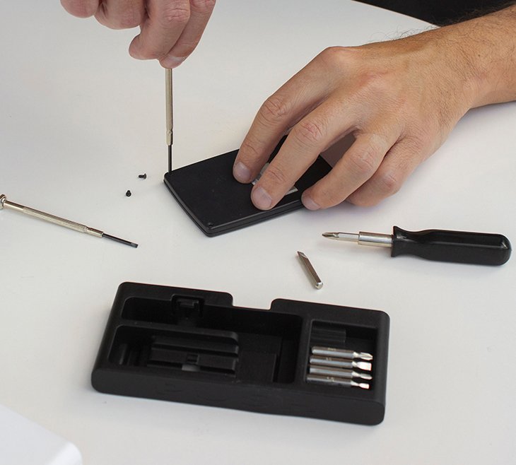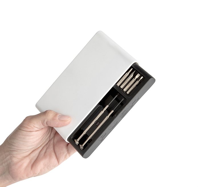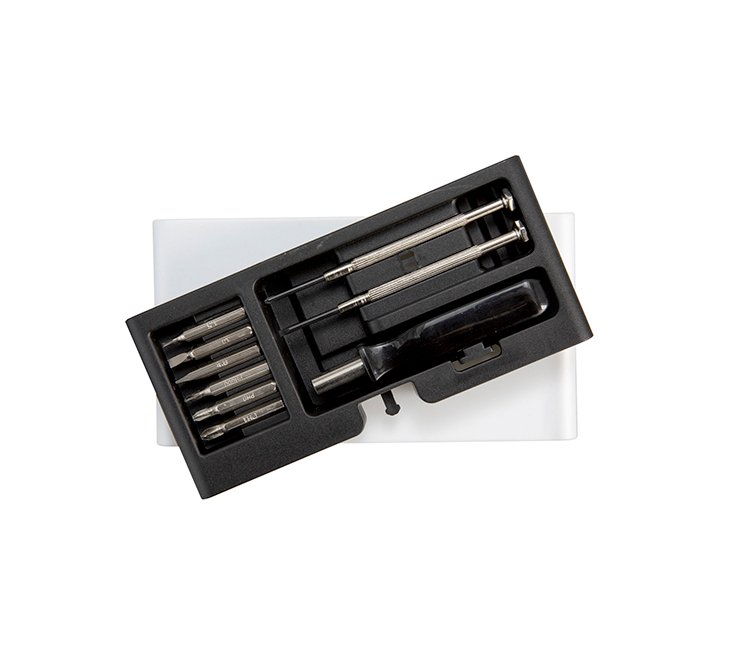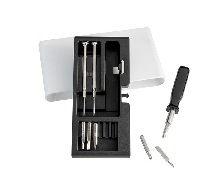 Set de destornilladores. Incluye: 1 mango con punta imantada, 6 puntas diferentes (3 planas: 1,5 ; 3 y 4 mm. y 3 phillips: 0000, 0 y 1mm.) y 2 destornilladores de precisión (1 plano y 1 phillips). Base imantada que permite mantener ordenadas las diferentes puntas. Apertura push.