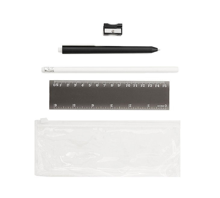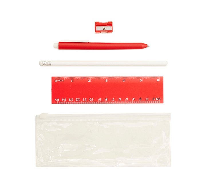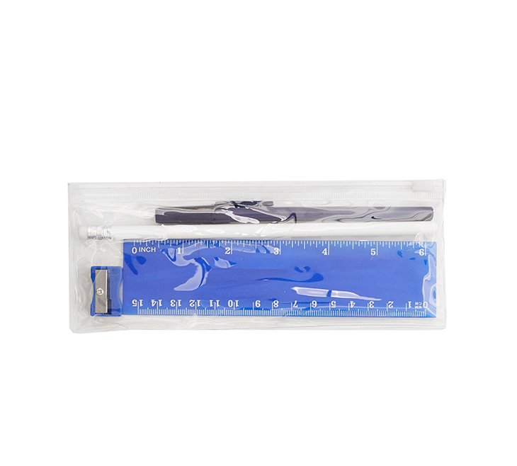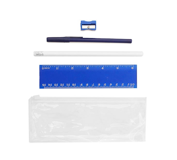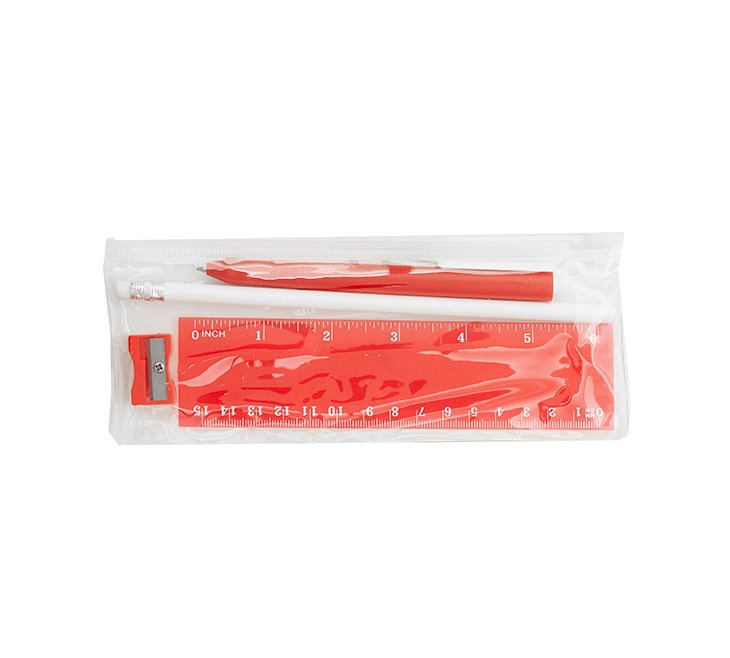 Cartuchera plástica transparente con cierre. Incluye: Bolígrafo (Tinta Azul), lápiz, regla y sacapuntas. Colores: negro, rojo y azul.